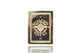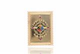 Targa con rubini e smalti, realizzata in oro giallo 750, Giubileo anno 2000, rubini rotondi e parti smaltate, corredato da blister, lievi imperfezioni - 9,5g