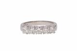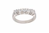 Anello con diamanti montati a griffe, realizzato in oro bianco 750, cinque diamanti taglio brillante ct 1,5 ca tot, colore H-J, purezza VVS-VS, uno con lieve scheggiatura, misura 20 - Grammi 7,10