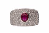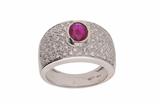 Anello con pave' di diamanti e rubino centrale, realizzato in oro bianco 750, diamanti taglio brillante ct 0.70 ca tot, colore H-J, purezza VS-SI, misura 20.5 - Grammi 12,30