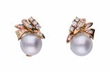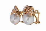 Coppia di orecchini con diamanti e perle coltivate, realizzata in oro giallo 750, diamanti taglio brillante ct 0.25 ca tot, colore H-J, purezza VVS-VS, perle irregolari mm 11 ca - Grammi 10,80