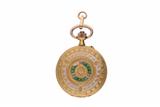Orologino con piccoli diamanti taglio rosa, in oro giallo 750 con motivo a rosone realizzato con smalti policromi, movimento manuale, quadrante a raggiera color oro, smalti con parti mancanti, lievi ammaccature, non funzionante, si raccomanda assistenza tecnica - Grammi 15,70