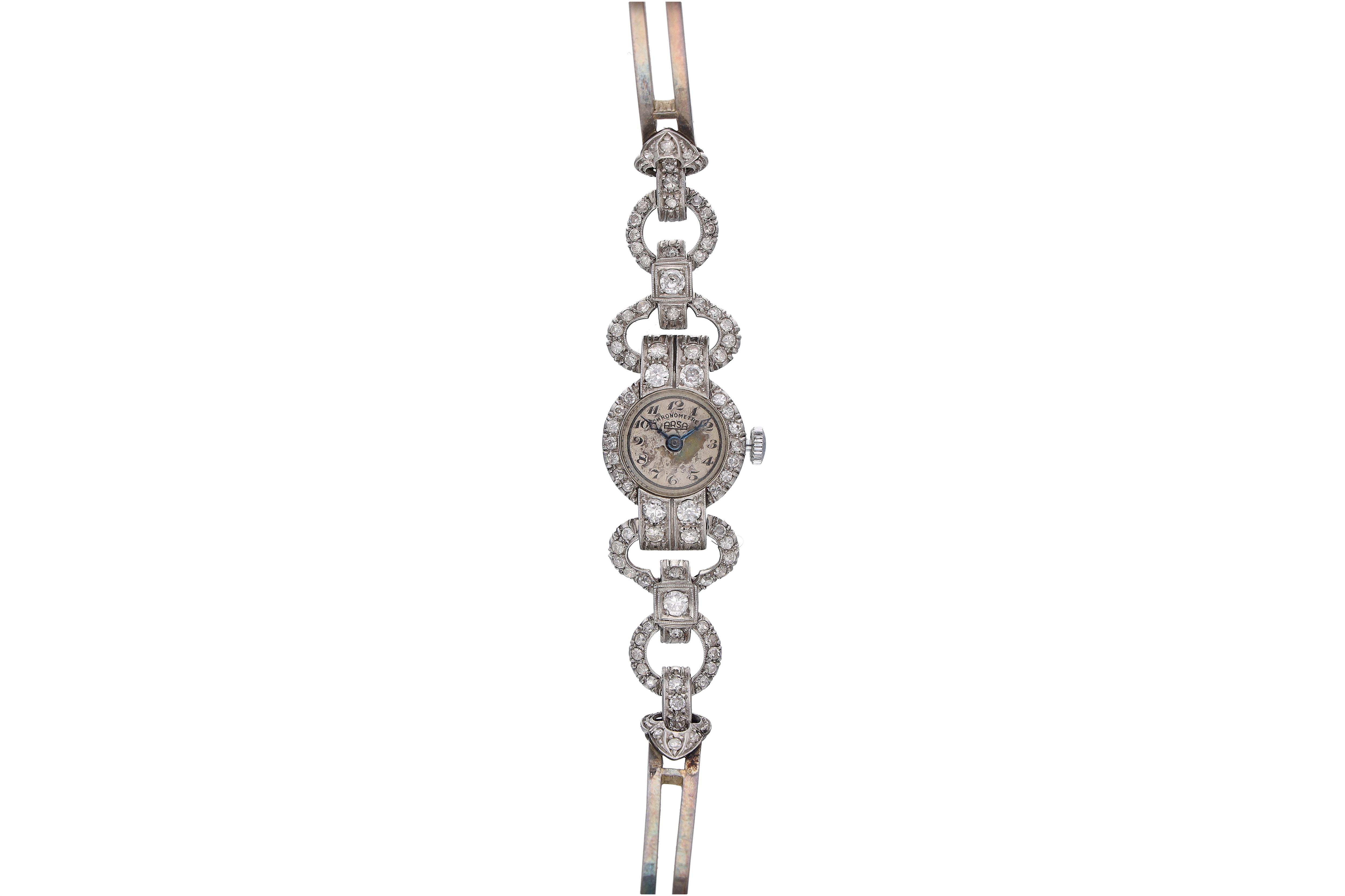 Arsa, orologio in oro e platino con diamanti, anni '30-40, movimento a carica manuale, quadrante indici con numeri arabi, diamanti diversi tagli ct 1,6 tot. circa, colore I-K, purezza VS-SI, dim 16 mm, quadrante con difetti, ossidazioni, non funzionante, difetti, si raccomanda assistenza tecnica - Grammi 24,80