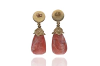 Paio di orecchini con coralli realizzati in oro 750, coralli a goccia con amorini scolpiti, chiusura con perni e fermi, imperfezioni - Grammi 23,40