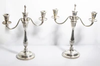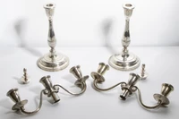 Coppia di candelabri scomponibili e candelieri, con spegni candela, realizzati in argento 800, base appesantita, h complessiva cm 35,5 x 29,5, ammaccature, difetti - Grammi 2.316,10