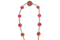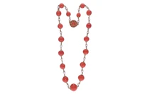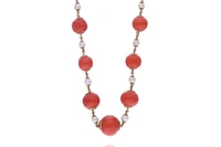 Collana con coralli e perle coltivate, in oro 750, coralli a gradazione di forma sferica 11- 21 mm, perle coltivate 6,5 mm, lunghezza 66,5 cm, fermezza in oro e coralli punzone 84 FI, imperfezioni - Grammi 110,90