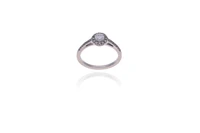 Anello con diamanti, realizzato in oro bianco 750, diamante centrale taglio brillante, ct 0,30 circa, colore H-J, purezza VS-SI, affiancato da diamanti taglio brillante, ct 0,15 totali circa, colore I-K, purezza VS-SI, misura 15, minuta scheggiatura, imperfezioni - Grammi 2,80
