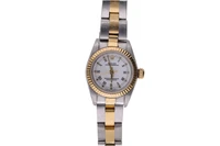 Rolex Oyster Perpetual Lady, orologio acciaio e oro, ref 67193, a 1992, mov aut, cal 2130, matr N51****, bracciale Oyster acc e oro, chiusura deployante, 24 mm, graffi, movimento con gravi ossidazioni, albero di carica bloccato, non funzionante, si raccomanda assistenza tecnica - Grammi 54,60