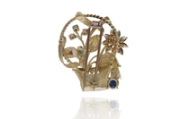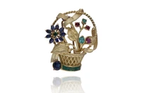 Spilla a forma di cestino con fiori e foglie impreziositi da zaffiri, smeraldi e rubini, realizzata in oro giallo 750, zaffiri, smeraldi e rubini tagli e forme diversi, scheggiature ed imperfezioni - Grammi 21,00
