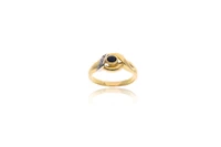 Anello con zaffiro e diamanti, in oro a due colori 750, diamanti taglio huit huit ct 0,02 totali circa, zaffiro ovale sfaccettato, misura 20 - Grammi 5,50