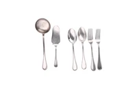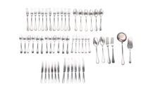 Posate in argento: 12 forchette da tavola, 6 cucchiai da tavola, 6 forchette da dolce, 12 cucchiai da dolce, 2 cucchiai portata, 2 forchette portata, mestolo, paletta per dolci, in argento 800 (2780 gr), 6 coltelli da tavola, 6 coltelli da dolce in argento, altro materiale (1150 gr), imperfezioni - Grammi 3.930,00