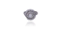 Anello con diamanti, realizzato in oro bianco 750, diamante centrale taglio brillante ct 0,60 circa, colore I-K, purezza VS2-SI1, impreziosito da diamanti taglio brillante e huit-huit ct 2 totali circa, colore I-K, purezza VS-SI, misura 19, difetti - Grammi 7,40