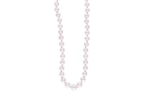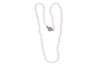 Collana perle coltivate mm 6-9, chiusura realizzata in oro bianco 750 con perla coltivata mm 4,5-5, affiancata da zaffiri taglio composito forma rotonda, lunghezza cm 63, difetti - Grammi 41,00