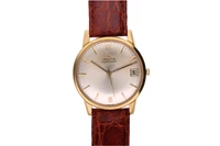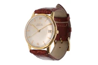 Zenith Stellina, orologio in oro, movimento automatico, calibro 2532, vetro plastica, quadrante grigio con difetti, secondi al centro, datario al 3, cinturino commerciale in pelle, dim 35 mm, parti graffiate, si consiglia assistenza tecnica - Grammi 39,50