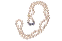 Collana di perle coltivate, chiusura in oro bianco 750 con piccoli diamanti e pietre blu, , diamanti taglio huit huit ct 0,02 ca tot, imperfezioni, perle mm 7 ca con difetti di cui una di imitazione, lunghezza cm 60 - Grammi 41,70