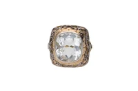Anello con piccoli diamanti e goshenite centrale, realizzato con lavorazione a traforo in oro giallo 750 con parte in argento, scheggiature, imperfezioni, misura 16 - Grammi 7,10