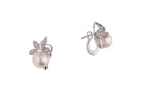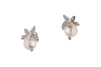 Paio di orecchini con diamanti e perle coltivate, realizzato in oro bianco 750, diamanti taglio brillante ct. 0,10 ca tot, colore H-J purezza VVS-VS, perle mm 8, imperfezioni, chiusura perno e clip - Grammi 4,50