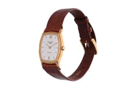 Longines, orologio in oro, movimento al quarzo, calibro L153,2, vetro zaffiro, quadrante avorio, cinturino commerciale in pelle, fibbia ad ardiglione dorata, dim mm 2,3x2, imperfezioni e lievi graffi, non testato, non funzionante, si raccomanda assistenza tecnica - Grammi 15,60
