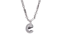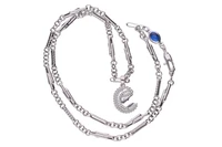 Collana con pietra blu, realizzata a maglie circolari alternate da maglie a losanga alcune con intreccio e ciondolo raffigurante madonna con bambino adornato da pave' di pietre incolore, in oro bianco 750, imperfezioni, lungh. collana cm. 50, dim ciondolo mm 16x13 - Grammi 9,00