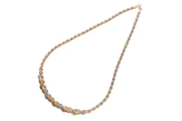 Collier semirigido con maglie a palmetta di dimensione crescente con lavorazione lucida, satinata e diamantata, realizzato in oro giallo e bianco 750, imperfezioni, lungh. cm 45 - Grammi 13,60