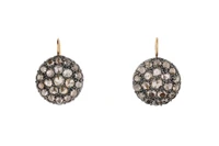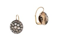 Paio di orecchini a toppa con diamanti, montatura in oro giallo 750 e parte in argento, diamanti taglio rosa corone' ct 3,6 ca tot, presenza di scheggiature e imperfezioni, chiusura ponte e molla, diametro cm 2 - Grammi 12,50