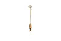 Spillone da cravatta con diamante, realizzato in oro giallo 750, diamante taglio brillante ct 0,60 ca, colore I-K, purezza VSS-VS, fermo di sicurezza in metallo fuori peso, imperfezioni e parte dissaldata - Grammi 1,20