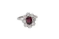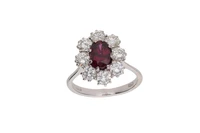 Anello a margherita con rubino e diamanti, incastonati su montatura a fili realizzata in oro bianco 750, diamanti taglio brillante ct 1,4 ca tot, colore H-J, purezza VVS-VS, rubino ct 1,3 ca, lieve scheggiatura, imperfezioni, dim. cm 1,5x1,3 ca, misura 15 - Grammi 4,40
