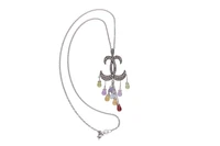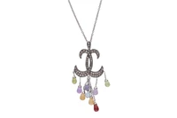 Collana con ciondolo impreziosito da diamanti colorati, tormaline, olivine, topazi e quarzi, realizzati in oro bianco 750, diamanti colorati taglio brillante ct 1,1 ca tot, purezza VS-SI, imperfezioni, dimensioni cm 5,5x2,5 ca, lunghezza cm 40 - Grammi 9,10