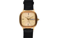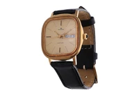 Pryngeps, orologio in oro, movimento automatico, calibro Eta 2789, vetro plastica, quadrante dorato, giorno e data ad ore 3, cinturino in pelle logoro, dim mm 34x34, graffi, imperfezioni, non funzionante, si raccomanda assistenza tecnica - Grammi 44,40