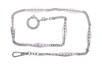 Catena per orologio da tasca, composta da losanghe raccordate da maglie groumette, realizzata in oro bianco 750, imperfezioni, lunghezza cm 40 - Grammi 16,60