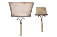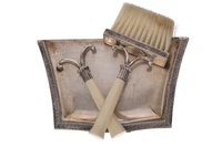Set raccogli briciole in argento 800 con decoro stile impero, manici in materiale non prezioso, di cui uno dissaldato, imperfezioni e ossidazioni - Grammi 205,00