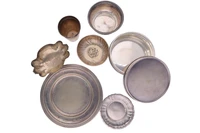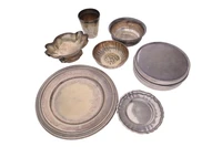 2 Piattini, 3 ciotoline, scatola e piccolo bicchiere in argento 800, parti incise e ammaccate - Grammi 300,00