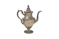 M. Fred Hirsch Co. , caffettiera in argento sterling 925, produzione americana anni '40, bordure in stile San Marco, manico e becco a volute, coperchio con pomo fitomorfo, isolanti in altro materiale, lievi ammaccature e abrasioni, incisioni personalizzate, h cm 28 - Grammi 828,00