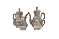 Servizio da caffe'-te in argento 800, stile inglese, ammaccature e graffi - Caffettiera h cm 19, teiera h cm 19, lattiera h cm 11, zuccheriera h cm 15 - Grammi 1.080,00