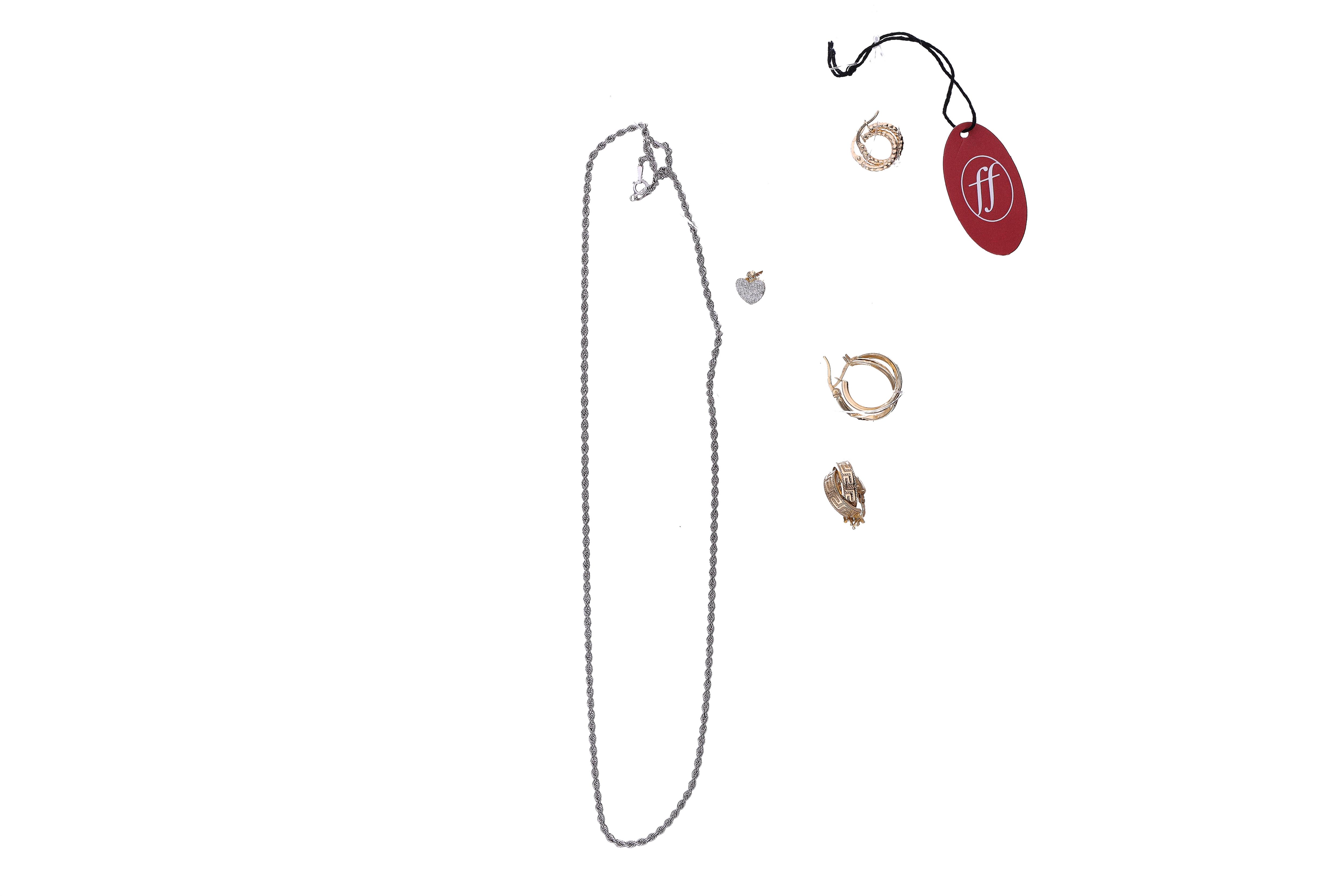 2 Orecchini, 1 ciondolo, in oro, pietre, pietre mancanti, parti ammaccate, difetti, 1,7g - 2 orecchini,1 collana, in oro, difetti, 3g - 2 orecchini, in oro basso, difetti 1,2g, (#3,6g) - Grammi 5,90