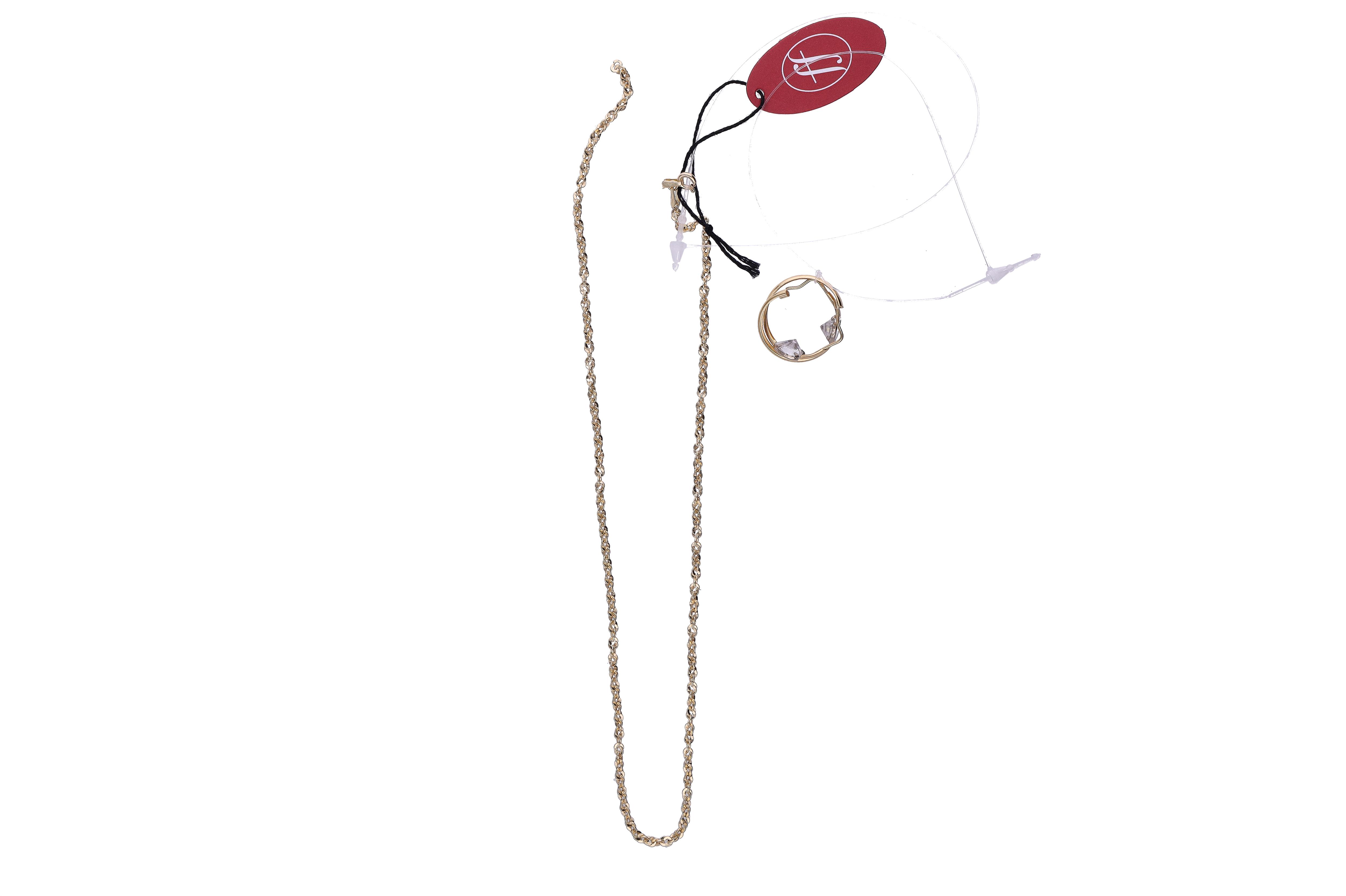 2 Orecchini, in oro, pietre, parti ammaccate, difetti, 2,6g - 1 collana, in oro, parte rotta e staccata, difetti 2,2g, (#of3,1g) - Grammi 4,90
