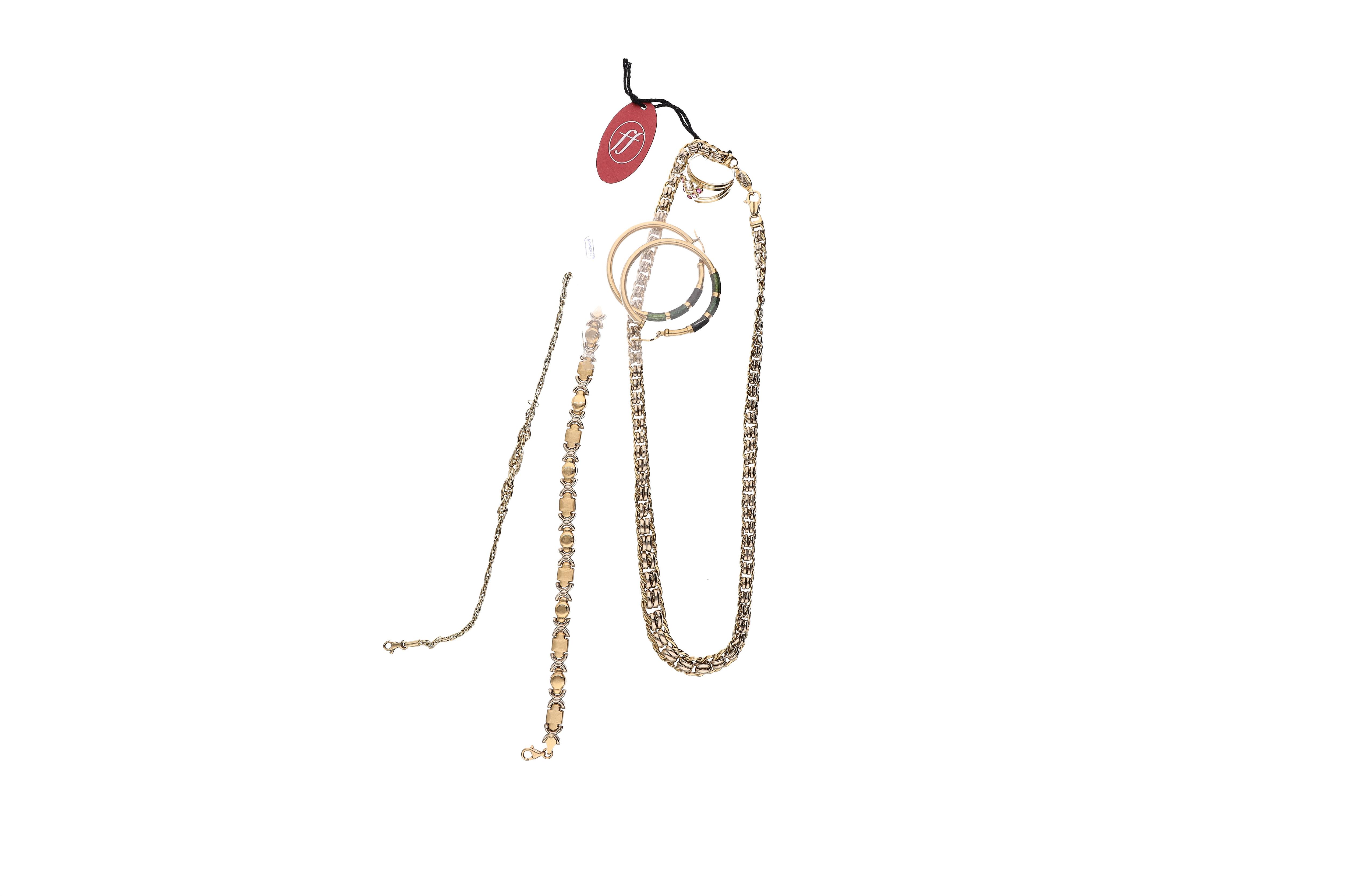 Collana, 2 bracciali in oro 32,1g - anello, 2 orecchini in oro, pietre, smalti 9,7g; parti ammaccate, difetti (#of29,8g) - Grammi 41,80