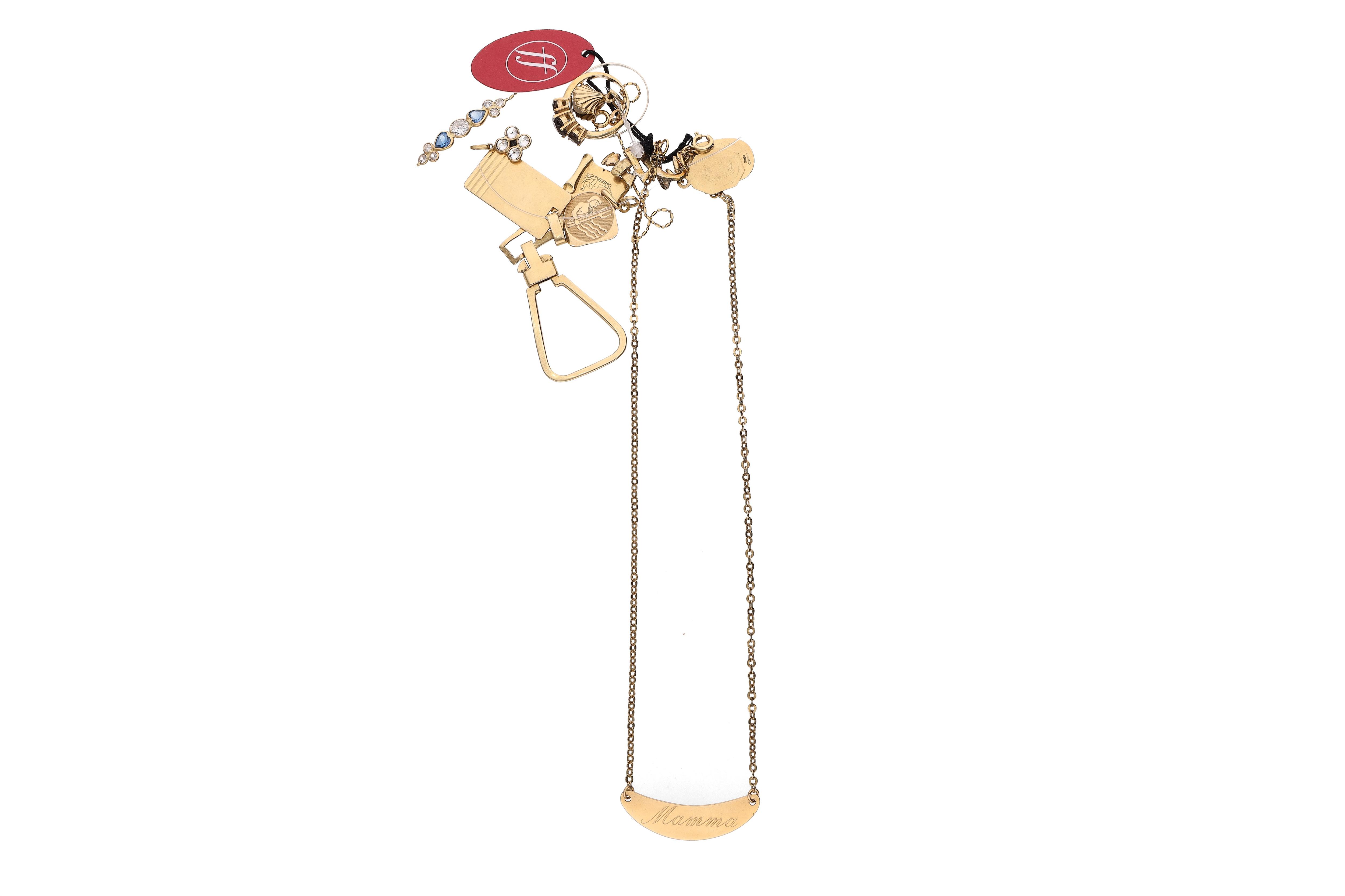 Portachiavi, 5 ciondoli, 1 collana, 1 anello in oro 30,4g - 2 ciondoli, 1 anello, 1 bracciale parte rotta e staccata, in oro, pietre 9,3g - difetti (#of28g) - Grammi 39,80