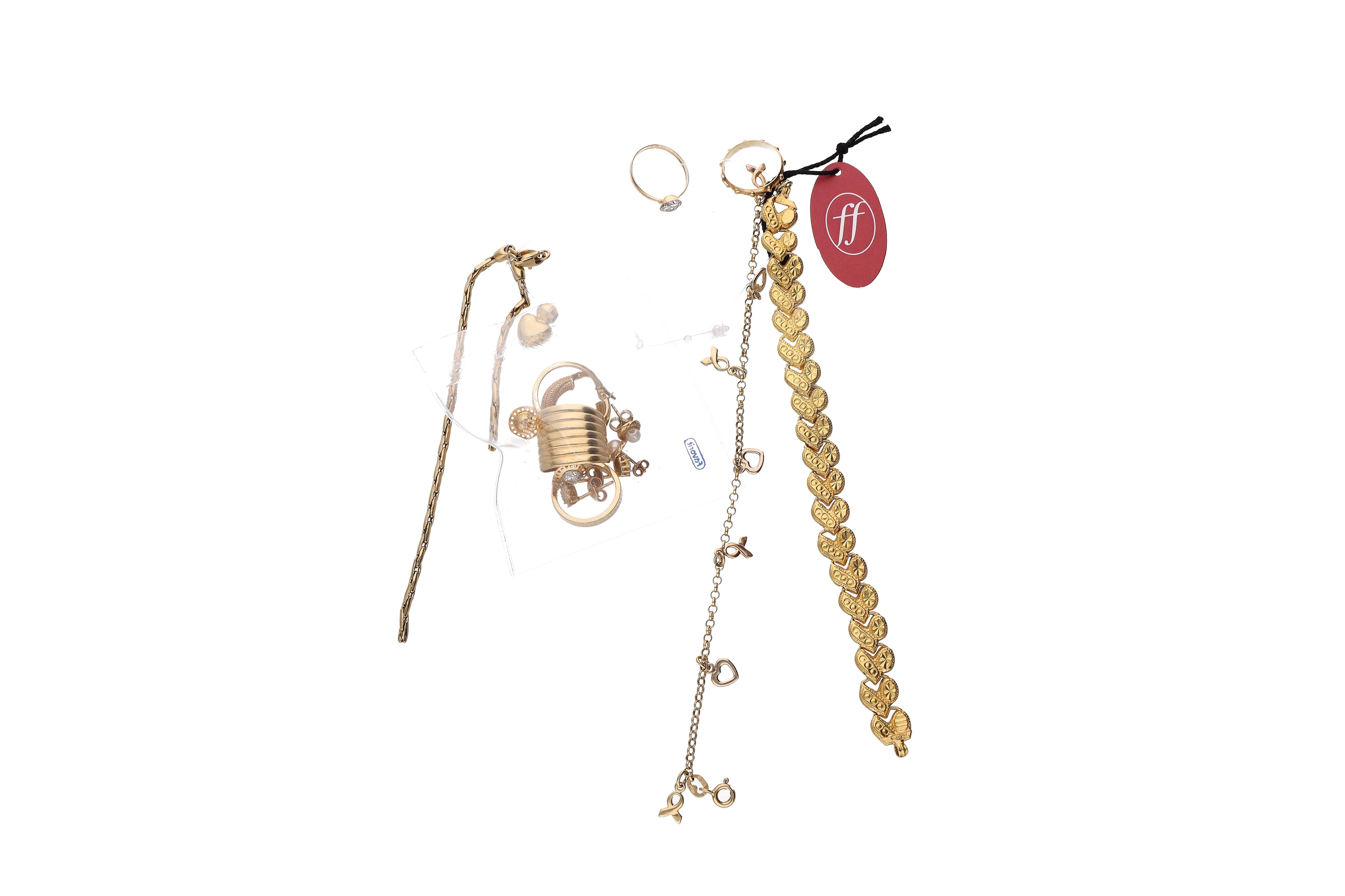 3 Orecchini, 2 Anelli, 1 ciondolo, 3 bracciali, in oro, parti rotte e mancanti, difetti, 33,2g - 6 Orecchini, 1 anello, in oro, pietre, parti mancanti, difetti, 4,1g -fuori peso 1 fermo in metallo 0,1g, (#of26,2g) - Grammi 37,30