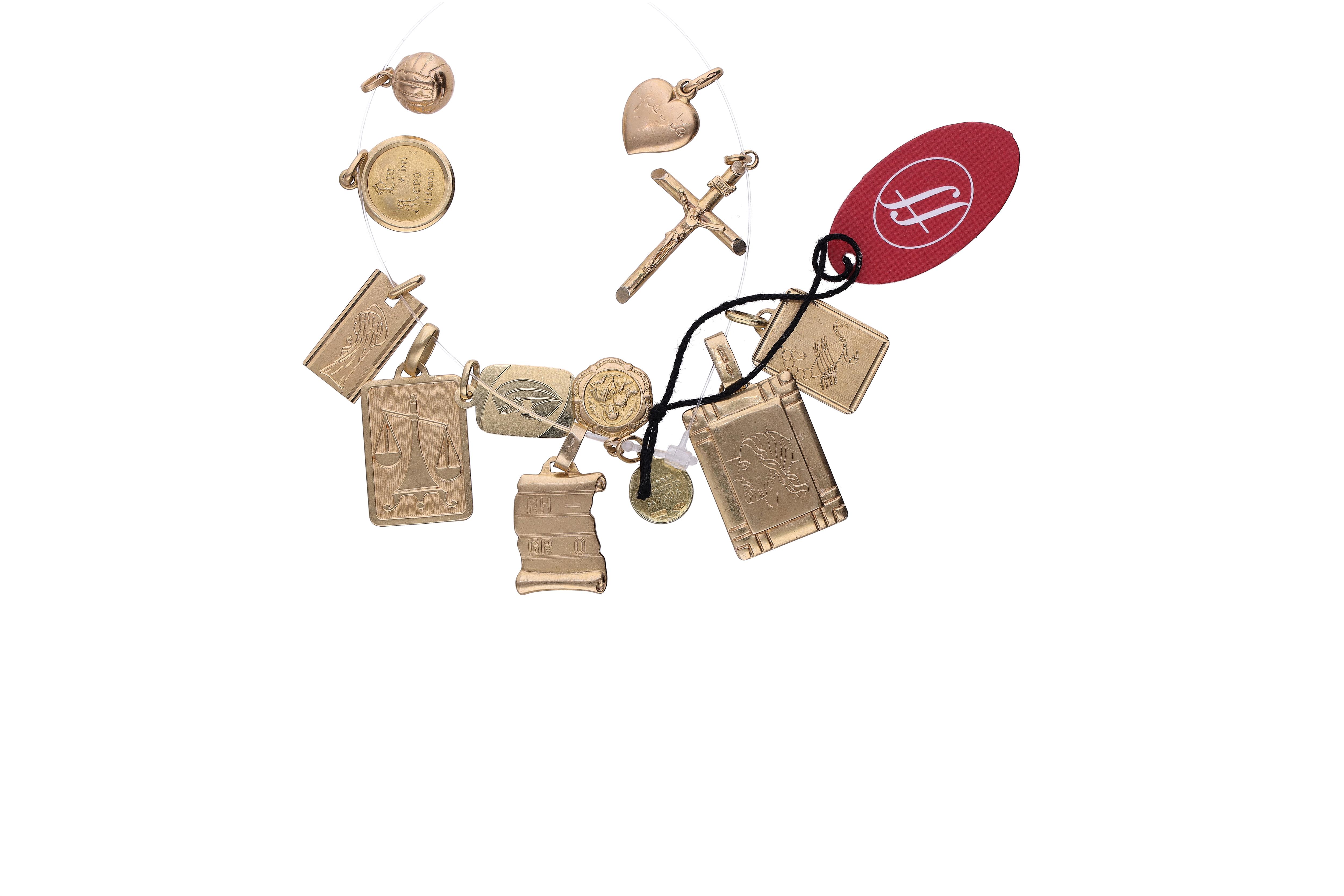 Dodici ciondoli, oro, pietra, parti incise, difetti (#of20,5g) - Grammi 28,00
