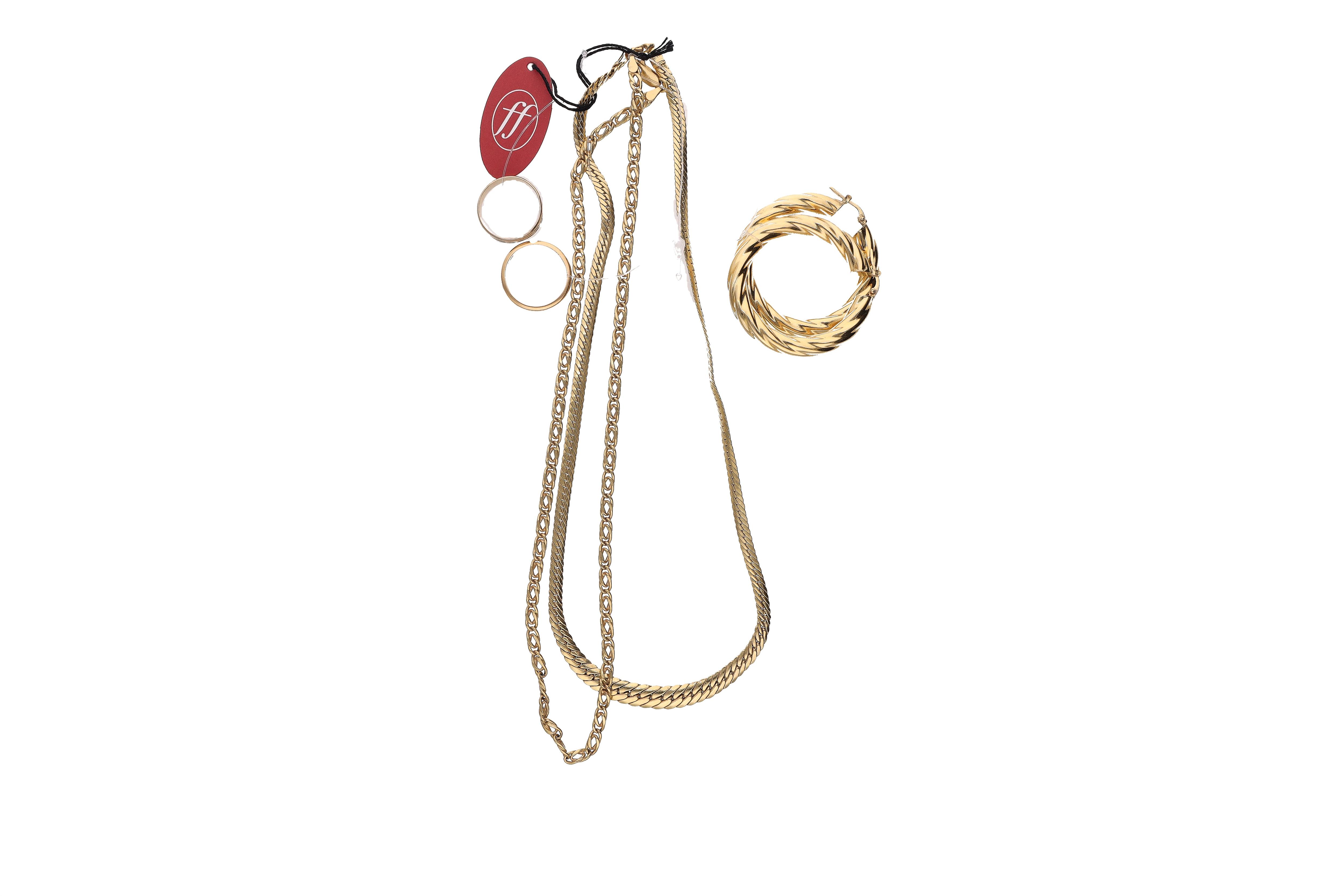 2 Collane, 2 orecchini, 2 anelli, in oro, parti incise, ammaccate e graffiate, difetti (#of24g) - Grammi 32,90
