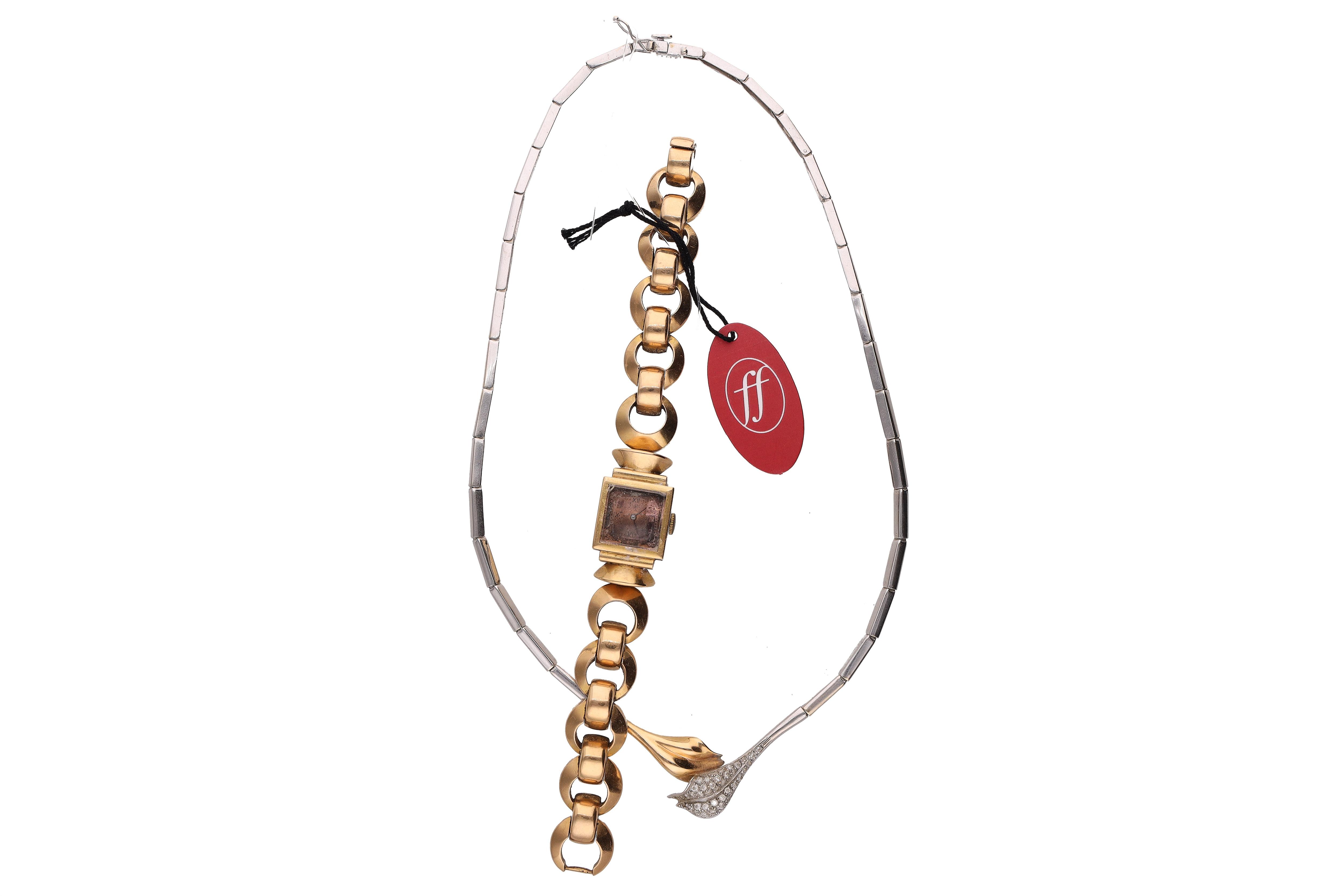 1 collana in oro pietre 22,2g - orologio con cassa e bracciale in oro, carica manuale, parti ossidate 47,6g - difetti (#of47g) - Grammi 69,60