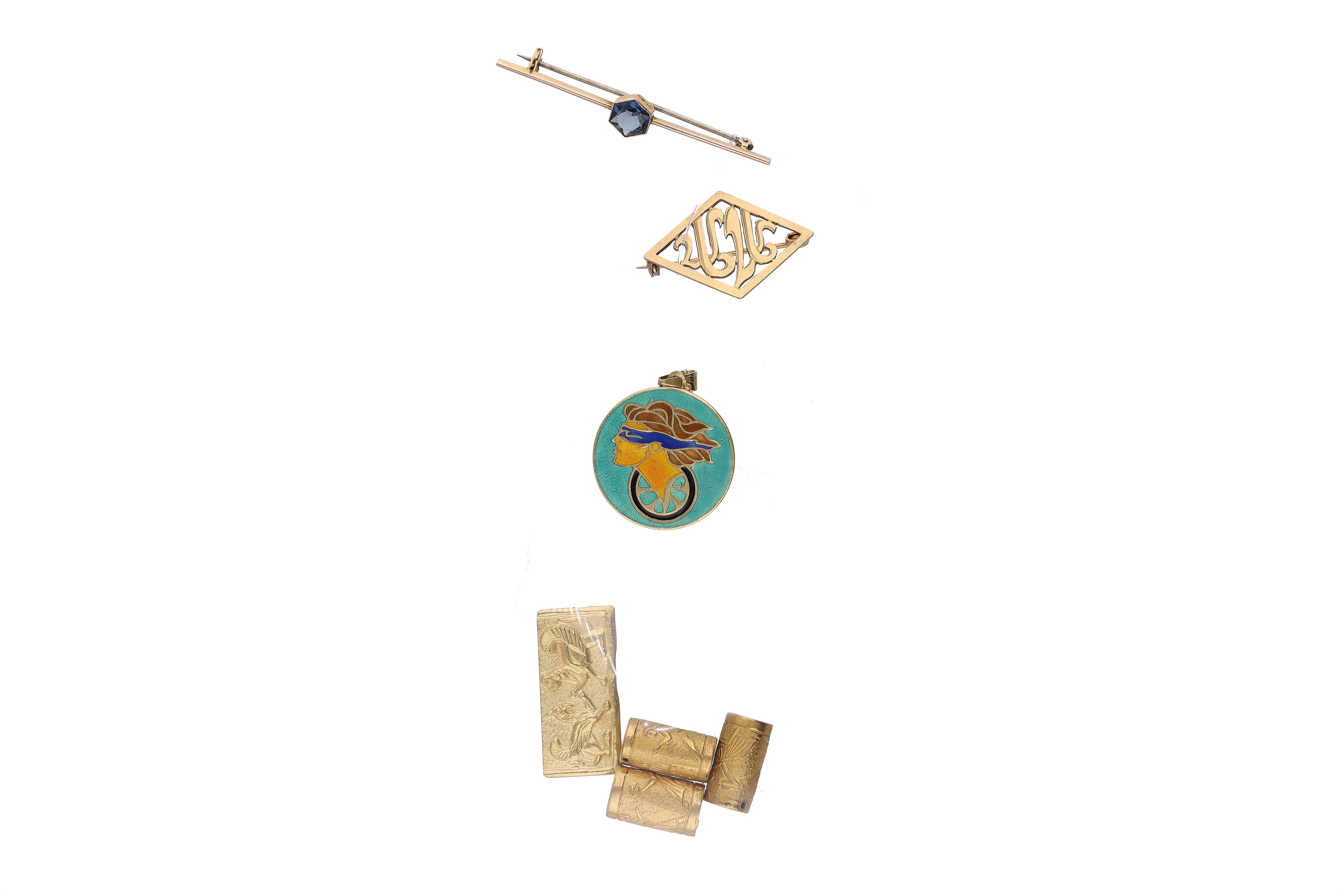 Spilla, ciondolo, 4 pezzi, oro, smalto, parti incise, difetti g 25,6 - spilla oro basso, pietra, difetti g 2,1 - (#of19,3g) - Grammi 27,70