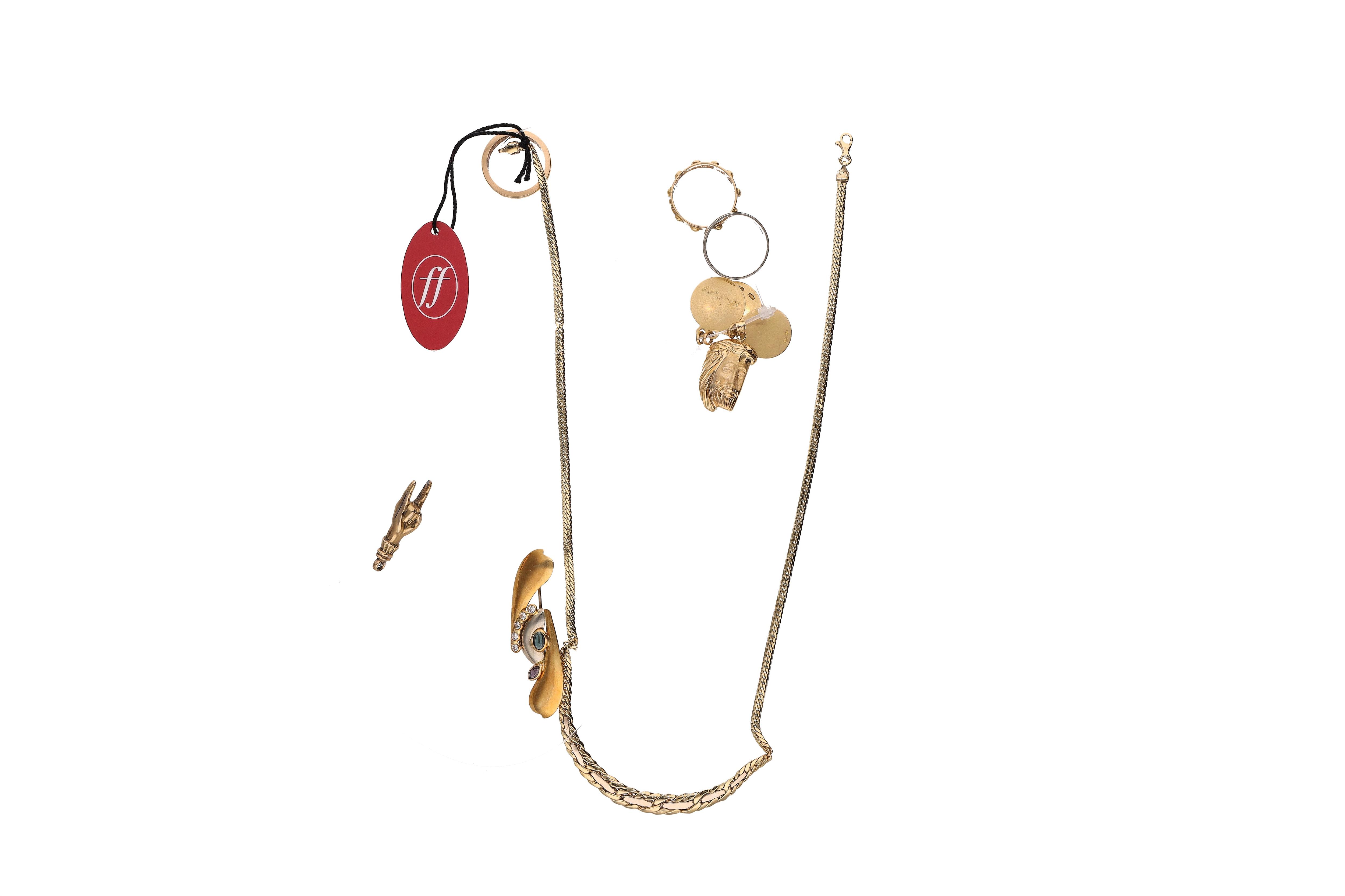 Collana, 3 anelli, 4 ciondoli, oro, parti incise, difetti g 24,3 - spilla oro pietre g 4,7 - ciondolo oro basso g 1,5 - (#of21,6g) - Grammi 30,50