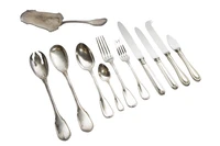 Cesa servizio di posate realizzata in argento 800, composta da: 7 forchette, 7 cucchiai, 5 forchettine, 6 cucchiaini, 3 posate da portata piu' fuori peso 13 coltelli e 2 due posate Greggio con parte in argento metallo e altro materiale - Grammi 1.851,90