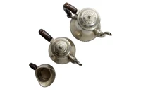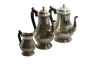 Ricci, Servizio realizzato in argento 800, decorato da baccellature e composto da: teiera h 23 x 21, caffettiera h cm 24,5 x 21 e lattiera h 12 x 13, zuccheriera mancante, manici in legno,difetti - Grammi 1.304,80