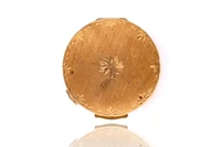 Portacipria in oro 750 con all'interno specchio, pouf e paravento, incisioni esterne, diametro 5 cm - Grammi 42,60