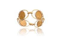 Bracciale con quattro monete, in oro a due colori 750, due sterline inglesi in oro 916, Elisabetta II, anno 1979, due 20 lire italiane in oro 900, Umberto I, anno 1882, lievi imperfezioni, lunghezza 19 cm - Grammi 50,80