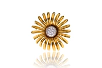 Ciondolo/spilla con diamanti, in oro due colori 750, diamanti taglio brillante ct 0,30 totali circa, colore I-K, purezza VS-SI, diametro 3,5 cm - Grammi 8,00