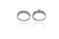 Coppia di anelli con diamanti realizzati in oro 500, diamanti taglio brillante ct 0,90 totali circa, colore I-K, purezza SI-P, misura 17, un diamante mancante, parti scheggiate, difetti - Grammi 6,70