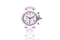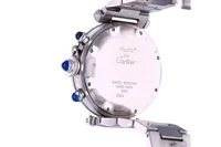 Cartier Pasha Chrono, cronografo acciaio, mov. quarzo, cal 053-Lemania 1270, ref 1050, mat CC24****, data, vetro zaffiro, quadrante argento guilloche', corona e tasti a pompa con zaffiri, bracciale curved acciaio, dim 38 mm - imperfezioni, cronografia da revisionare, si consiglia assistenza tecnica - Grammi 114,10